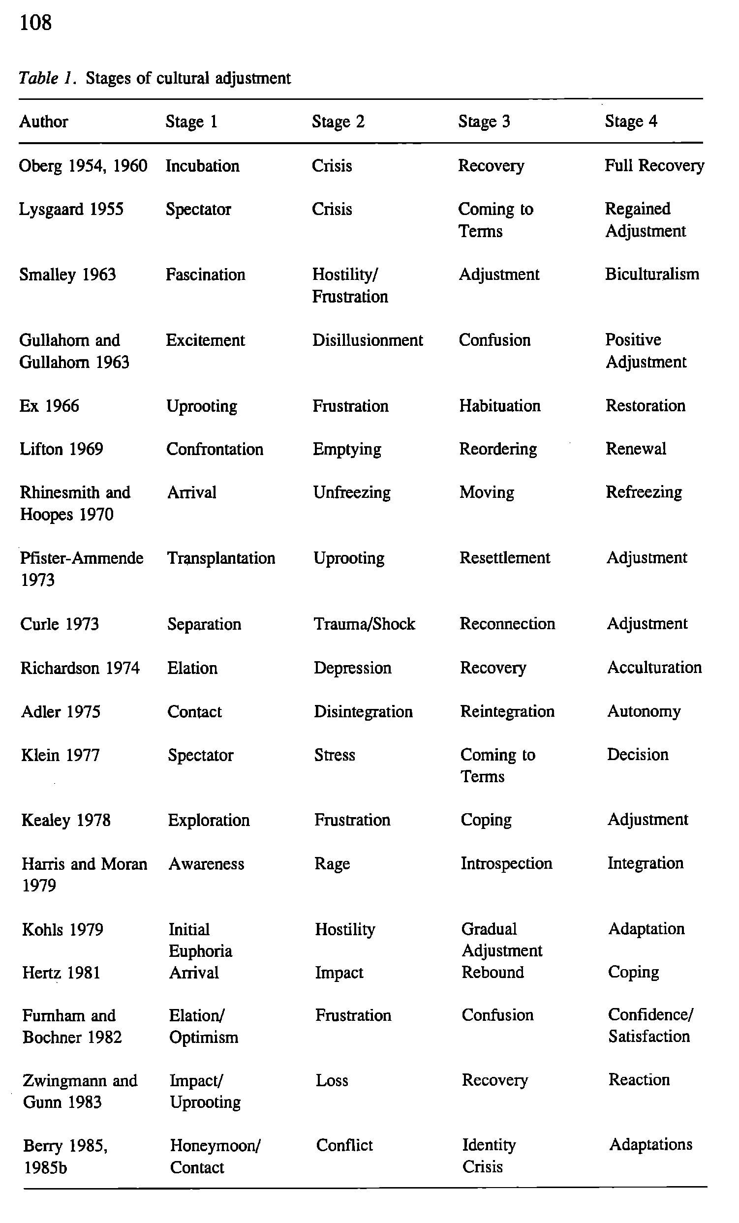 Adjusting to a new country, culture, and language has its ups and downs. "There appears to be general agreement in [the] literature that a person entering a new culture will progress through a series of states as summarized in Table 1." (Zapf, 1991) However, there are many different models floating around. Zapt charted 19 of them, and that just goes through 1991!